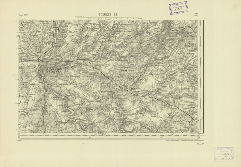 "Paris. - Service Géograèhique de l'Armée, 1889. Ebbe origine dall'Edizione zincografica in quarti di foglio, stabilita fino dal 1879, per la Carta detta de "L'etat-Major". Infatti non rispondendo più il sistema della riproduzione zincografica alle esigenze che la revisione dei fogli imponeva per un inevitabile logoramento dei rami originali, fu proposta dapprima la correzione degli zinchi, ma questo, importando un lavoro lungo e gravoso, si adottò il procedimento galvanico. I rami galvanici ottenuti e corretti secondo questo sistema presero il nome di "édition type 1889". Allo scopo di facilitare l'incisione fu adoperata la suddivisione in quarti di foglio come per l'edizione zincografica. la revisione dei fogli di questo tipo nnn fu iniziata che nel 1893. Dal catalogo del S.G.A. risultano mancanti a questa edizione i dipartimenti della "Moselle", del "Bas-Rhin" e del "Haut-Rhin" per le quali non esiste che una edizione in fogli interi aggiornata nel 1901."