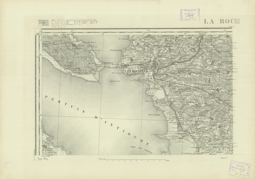 "Paris. - Service Géograèhique de l'Armée, 1889. Ebbe origine dall'Edizione zincografica in quarti di foglio, stabilita fino dal 1879, per la Carta detta de "L'etat-Major". Infatti non rispondendo più il sistema della riproduzione zincografica alle esigenze che la revisione dei fogli imponeva per un inevitabile logoramento dei rami originali, fu proposta dapprima la correzione degli zinchi, ma questo, importando un lavoro lungo e gravoso, si adottò il procedimento galvanico. I rami galvanici ottenuti e corretti secondo questo sistema presero il nome di "édition type 1889". Allo scopo di facilitare l'incisione fu adoperata la suddivisione in quarti di foglio come per l'edizione zincografica. la revisione dei fogli di questo tipo nnn fu iniziata che nel 1893. Dal catalogo del S.G.A. risultano mancanti a questa edizione i dipartimenti della "Moselle", del "Bas-Rhin" e del "Haut-Rhin" per le quali non esiste che una edizione in fogli interi aggiornata nel 1901."