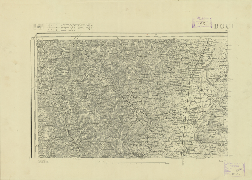 "Paris. - Service Géograèhique de l'Armée, 1889. Ebbe origine dall'Edizione zincografica in quarti di foglio, stabilita fino dal 1879, per la Carta detta de "L'etat-Major". Infatti non rispondendo più il sistema della riproduzione zincografica alle esigenze che la revisione dei fogli imponeva per un inevitabile logoramento dei rami originali, fu proposta dapprima la correzione degli zinchi, ma questo, importando un lavoro lungo e gravoso, si adottò il procedimento galvanico. I rami galvanici ottenuti e corretti secondo questo sistema presero il nome di "édition type 1889". Allo scopo di facilitare l'incisione fu adoperata la suddivisione in quarti di foglio come per l'edizione zincografica. la revisione dei fogli di questo tipo nnn fu iniziata che nel 1893. Dal catalogo del S.G.A. risultano mancanti a questa edizione i dipartimenti della "Moselle", del "Bas-Rhin" e del "Haut-Rhin" per le quali non esiste che una edizione in fogli interi aggiornata nel 1901."