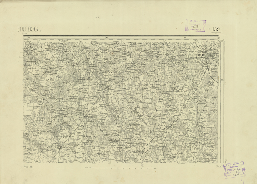 "Paris. - Service Géograèhique de l'Armée, 1889. Ebbe origine dall'Edizione zincografica in quarti di foglio, stabilita fino dal 1879, per la Carta detta de "L'etat-Major". Infatti non rispondendo più il sistema della riproduzione zincografica alle esigenze che la revisione dei fogli imponeva per un inevitabile logoramento dei rami originali, fu proposta dapprima la correzione degli zinchi, ma questo, importando un lavoro lungo e gravoso, si adottò il procedimento galvanico. I rami galvanici ottenuti e corretti secondo questo sistema presero il nome di "édition type 1889". Allo scopo di facilitare l'incisione fu adoperata la suddivisione in quarti di foglio come per l'edizione zincografica. la revisione dei fogli di questo tipo nnn fu iniziata che nel 1893. Dal catalogo del S.G.A. risultano mancanti a questa edizione i dipartimenti della "Moselle", del "Bas-Rhin" e del "Haut-Rhin" per le quali non esiste che una edizione in fogli interi aggiornata nel 1901."