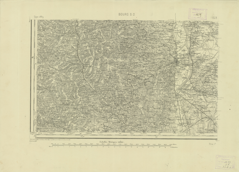 "Paris. - Service Géograèhique de l'Armée, 1889. Ebbe origine dall'Edizione zincografica in quarti di foglio, stabilita fino dal 1879, per la Carta detta de "L'etat-Major". Infatti non rispondendo più il sistema della riproduzione zincografica alle esigenze che la revisione dei fogli imponeva per un inevitabile logoramento dei rami originali, fu proposta dapprima la correzione degli zinchi, ma questo, importando un lavoro lungo e gravoso, si adottò il procedimento galvanico. I rami galvanici ottenuti e corretti secondo questo sistema presero il nome di "édition type 1889". Allo scopo di facilitare l'incisione fu adoperata la suddivisione in quarti di foglio come per l'edizione zincografica. la revisione dei fogli di questo tipo nnn fu iniziata che nel 1893. Dal catalogo del S.G.A. risultano mancanti a questa edizione i dipartimenti della "Moselle", del "Bas-Rhin" e del "Haut-Rhin" per le quali non esiste che una edizione in fogli interi aggiornata nel 1901."