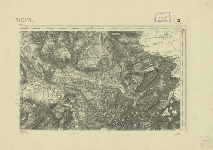 "Paris. - Service Géograèhique de l'Armée, 1889. Ebbe origine dall'Edizione zincografica in quarti di foglio, stabilita fino dal 1879, per la Carta detta de "L'etat-Major". Infatti non rispondendo più il sistema della riproduzione zincografica alle esigenze che la revisione dei fogli imponeva per un inevitabile logoramento dei rami originali, fu proposta dapprima la correzione degli zinchi, ma questo, importando un lavoro lungo e gravoso, si adottò il procedimento galvanico. I rami galvanici ottenuti e corretti secondo questo sistema presero il nome di "édition type 1889". Allo scopo di facilitare l'incisione fu adoperata la suddivisione in quarti di foglio come per l'edizione zincografica. la revisione dei fogli di questo tipo nnn fu iniziata che nel 1893. Dal catalogo del S.G.A. risultano mancanti a questa edizione i dipartimenti della "Moselle", del "Bas-Rhin" e del "Haut-Rhin" per le quali non esiste che una edizione in fogli interi aggiornata nel 1901."