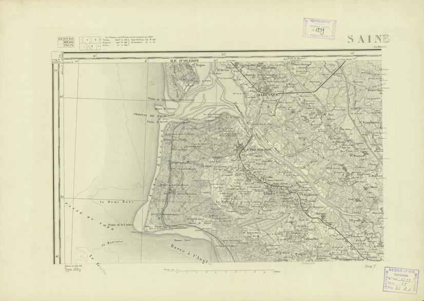 "Paris. - Service Géograèhique de l'Armée, 1889. Ebbe origine dall'Edizione zincografica in quarti di foglio, stabilita fino dal 1879, per la Carta detta de "L'etat-Major". Infatti non rispondendo più il sistema della riproduzione zincografica alle esigenze che la revisione dei fogli imponeva per un inevitabile logoramento dei rami originali, fu proposta dapprima la correzione degli zinchi, ma questo, importando un lavoro lungo e gravoso, si adottò il procedimento galvanico. I rami galvanici ottenuti e corretti secondo questo sistema presero il nome di "édition type 1889". Allo scopo di facilitare l'incisione fu adoperata la suddivisione in quarti di foglio come per l'edizione zincografica. la revisione dei fogli di questo tipo nnn fu iniziata che nel 1893. Dal catalogo del S.G.A. risultano mancanti a questa edizione i dipartimenti della "Moselle", del "Bas-Rhin" e del "Haut-Rhin" per le quali non esiste che una edizione in fogli interi aggiornata nel 1901."