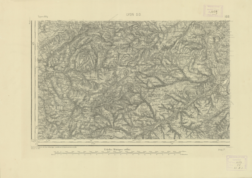 "Paris. - Service Géograèhique de l'Armée, 1889. Ebbe origine dall'Edizione zincografica in quarti di foglio, stabilita fino dal 1879, per la Carta detta de "L'etat-Major". Infatti non rispondendo più il sistema della riproduzione zincografica alle esigenze che la revisione dei fogli imponeva per un inevitabile logoramento dei rami originali, fu proposta dapprima la correzione degli zinchi, ma questo, importando un lavoro lungo e gravoso, si adottò il procedimento galvanico. I rami galvanici ottenuti e corretti secondo questo sistema presero il nome di "édition type 1889". Allo scopo di facilitare l'incisione fu adoperata la suddivisione in quarti di foglio come per l'edizione zincografica. la revisione dei fogli di questo tipo nnn fu iniziata che nel 1893. Dal catalogo del S.G.A. risultano mancanti a questa edizione i dipartimenti della "Moselle", del "Bas-Rhin" e del "Haut-Rhin" per le quali non esiste che una edizione in fogli interi aggiornata nel 1901."