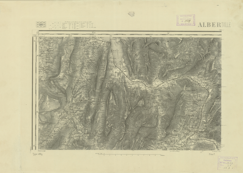 "Paris. - Service Géograèhique de l'Armée, 1889. Ebbe origine dall'Edizione zincografica in quarti di foglio, stabilita fino dal 1879, per la Carta detta de "L'etat-Major". Infatti non rispondendo più il sistema della riproduzione zincografica alle esigenze che la revisione dei fogli imponeva per un inevitabile logoramento dei rami originali, fu proposta dapprima la correzione degli zinchi, ma questo, importando un lavoro lungo e gravoso, si adottò il procedimento galvanico. I rami galvanici ottenuti e corretti secondo questo sistema presero il nome di "édition type 1889". Allo scopo di facilitare l'incisione fu adoperata la suddivisione in quarti di foglio come per l'edizione zincografica. la revisione dei fogli di questo tipo nnn fu iniziata che nel 1893. Dal catalogo del S.G.A. risultano mancanti a questa edizione i dipartimenti della "Moselle", del "Bas-Rhin" e del "Haut-Rhin" per le quali non esiste che una edizione in fogli interi aggiornata nel 1901."