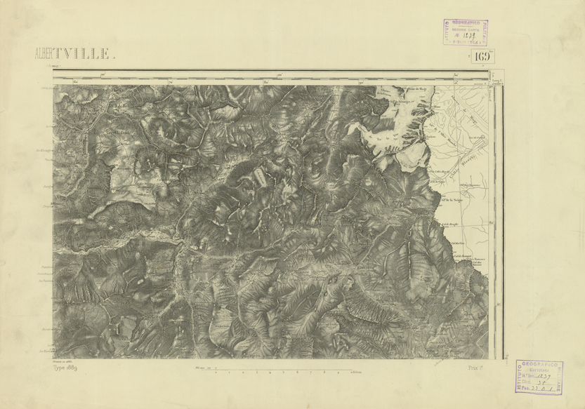 "Paris. - Service Géograèhique de l'Armée, 1889. Ebbe origine dall'Edizione zincografica in quarti di foglio, stabilita fino dal 1879, per la Carta detta de "L'etat-Major". Infatti non rispondendo più il sistema della riproduzione zincografica alle esigenze che la revisione dei fogli imponeva per un inevitabile logoramento dei rami originali, fu proposta dapprima la correzione degli zinchi, ma questo, importando un lavoro lungo e gravoso, si adottò il procedimento galvanico. I rami galvanici ottenuti e corretti secondo questo sistema presero il nome di "édition type 1889". Allo scopo di facilitare l'incisione fu adoperata la suddivisione in quarti di foglio come per l'edizione zincografica. la revisione dei fogli di questo tipo nnn fu iniziata che nel 1893. Dal catalogo del S.G.A. risultano mancanti a questa edizione i dipartimenti della "Moselle", del "Bas-Rhin" e del "Haut-Rhin" per le quali non esiste che una edizione in fogli interi aggiornata nel 1901."