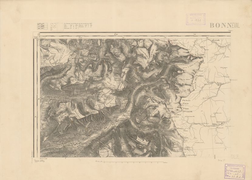 "Paris. - Service Géograèhique de l'Armée, 1889. Ebbe origine dall'Edizione zincografica in quarti di foglio, stabilita fino dal 1879, per la Carta detta de "L'etat-Major". Infatti non rispondendo più il sistema della riproduzione zincografica alle esigenze che la revisione dei fogli imponeva per un inevitabile logoramento dei rami originali, fu proposta dapprima la correzione degli zinchi, ma questo, importando un lavoro lungo e gravoso, si adottò il procedimento galvanico. I rami galvanici ottenuti e corretti secondo questo sistema presero il nome di "édition type 1889". Allo scopo di facilitare l'incisione fu adoperata la suddivisione in quarti di foglio come per l'edizione zincografica. la revisione dei fogli di questo tipo nnn fu iniziata che nel 1893. Dal catalogo del S.G.A. risultano mancanti a questa edizione i dipartimenti della "Moselle", del "Bas-Rhin" e del "Haut-Rhin" per le quali non esiste che una edizione in fogli interi aggiornata nel 1901."