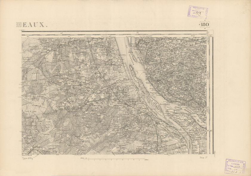 "Paris. - Service Géograèhique de l'Armée, 1889. Ebbe origine dall'Edizione zincografica in quarti di foglio, stabilita fino dal 1879, per la Carta detta de "L'etat-Major". Infatti non rispondendo più il sistema della riproduzione zincografica alle esigenze che la revisione dei fogli imponeva per un inevitabile logoramento dei rami originali, fu proposta dapprima la correzione degli zinchi, ma questo, importando un lavoro lungo e gravoso, si adottò il procedimento galvanico. I rami galvanici ottenuti e corretti secondo questo sistema presero il nome di "édition type 1889". Allo scopo di facilitare l'incisione fu adoperata la suddivisione in quarti di foglio come per l'edizione zincografica. la revisione dei fogli di questo tipo nnn fu iniziata che nel 1893. Dal catalogo del S.G.A. risultano mancanti a questa edizione i dipartimenti della "Moselle", del "Bas-Rhin" e del "Haut-Rhin" per le quali non esiste che una edizione in fogli interi aggiornata nel 1901."