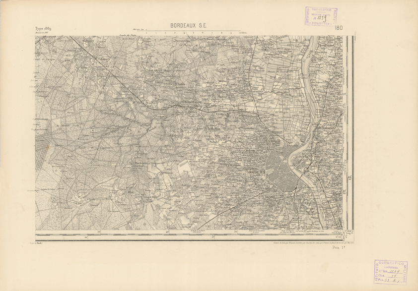 "Paris. - Service Géograèhique de l'Armée, 1889. Ebbe origine dall'Edizione zincografica in quarti di foglio, stabilita fino dal 1879, per la Carta detta de "L'etat-Major". Infatti non rispondendo più il sistema della riproduzione zincografica alle esigenze che la revisione dei fogli imponeva per un inevitabile logoramento dei rami originali, fu proposta dapprima la correzione degli zinchi, ma questo, importando un lavoro lungo e gravoso, si adottò il procedimento galvanico. I rami galvanici ottenuti e corretti secondo questo sistema presero il nome di "édition type 1889". Allo scopo di facilitare l'incisione fu adoperata la suddivisione in quarti di foglio come per l'edizione zincografica. la revisione dei fogli di questo tipo nnn fu iniziata che nel 1893. Dal catalogo del S.G.A. risultano mancanti a questa edizione i dipartimenti della "Moselle", del "Bas-Rhin" e del "Haut-Rhin" per le quali non esiste che una edizione in fogli interi aggiornata nel 1901."