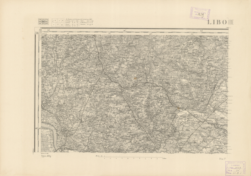 "Paris. - Service Géograèhique de l'Armée, 1889. Ebbe origine dall'Edizione zincografica in quarti di foglio, stabilita fino dal 1879, per la Carta detta de "L'etat-Major". Infatti non rispondendo più il sistema della riproduzione zincografica alle esigenze che la revisione dei fogli imponeva per un inevitabile logoramento dei rami originali, fu proposta dapprima la correzione degli zinchi, ma questo, importando un lavoro lungo e gravoso, si adottò il procedimento galvanico. I rami galvanici ottenuti e corretti secondo questo sistema presero il nome di "édition type 1889". Allo scopo di facilitare l'incisione fu adoperata la suddivisione in quarti di foglio come per l'edizione zincografica. la revisione dei fogli di questo tipo nnn fu iniziata che nel 1893. Dal catalogo del S.G.A. risultano mancanti a questa edizione i dipartimenti della "Moselle", del "Bas-Rhin" e del "Haut-Rhin" per le quali non esiste che una edizione in fogli interi aggiornata nel 1901."