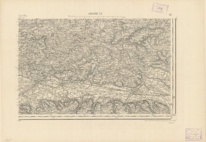 "Paris. - Service Géograèhique de l'Armée, 1889. Ebbe origine dall'Edizione zincografica in quarti di foglio, stabilita fino dal 1879, per la Carta detta de "L'etat-Major". Infatti non rispondendo più il sistema della riproduzione zincografica alle esigenze che la revisione dei fogli imponeva per un inevitabile logoramento dei rami originali, fu proposta dapprima la correzione degli zinchi, ma questo, importando un lavoro lungo e gravoso, si adottò il procedimento galvanico. I rami galvanici ottenuti e corretti secondo questo sistema presero il nome di "édition type 1889". Allo scopo di facilitare l'incisione fu adoperata la suddivisione in quarti di foglio come per l'edizione zincografica. la revisione dei fogli di questo tipo nnn fu iniziata che nel 1893. Dal catalogo del S.G.A. risultano mancanti a questa edizione i dipartimenti della "Moselle", del "Bas-Rhin" e del "Haut-Rhin" per le quali non esiste che una edizione in fogli interi aggiornata nel 1901."