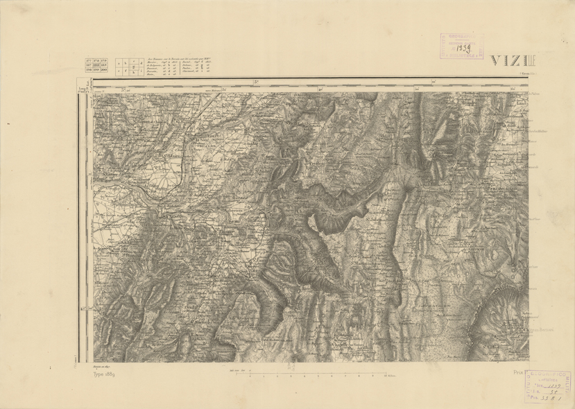 "Paris. - Service Géograèhique de l'Armée, 1889. Ebbe origine dall'Edizione zincografica in quarti di foglio, stabilita fino dal 1879, per la Carta detta de "L'etat-Major". Infatti non rispondendo più il sistema della riproduzione zincografica alle esigenze che la revisione dei fogli imponeva per un inevitabile logoramento dei rami originali, fu proposta dapprima la correzione degli zinchi, ma questo, importando un lavoro lungo e gravoso, si adottò il procedimento galvanico. I rami galvanici ottenuti e corretti secondo questo sistema presero il nome di "édition type 1889". Allo scopo di facilitare l'incisione fu adoperata la suddivisione in quarti di foglio come per l'edizione zincografica. la revisione dei fogli di questo tipo nnn fu iniziata che nel 1893. Dal catalogo del S.G.A. risultano mancanti a questa edizione i dipartimenti della "Moselle", del "Bas-Rhin" e del "Haut-Rhin" per le quali non esiste che una edizione in fogli interi aggiornata nel 1901."