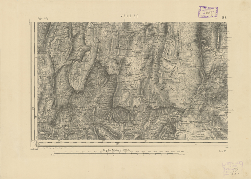 "Paris. - Service Géograèhique de l'Armée, 1889. Ebbe origine dall'Edizione zincografica in quarti di foglio, stabilita fino dal 1879, per la Carta detta de "L'etat-Major". Infatti non rispondendo più il sistema della riproduzione zincografica alle esigenze che la revisione dei fogli imponeva per un inevitabile logoramento dei rami originali, fu proposta dapprima la correzione degli zinchi, ma questo, importando un lavoro lungo e gravoso, si adottò il procedimento galvanico. I rami galvanici ottenuti e corretti secondo questo sistema presero il nome di "édition type 1889". Allo scopo di facilitare l'incisione fu adoperata la suddivisione in quarti di foglio come per l'edizione zincografica. la revisione dei fogli di questo tipo nnn fu iniziata che nel 1893. Dal catalogo del S.G.A. risultano mancanti a questa edizione i dipartimenti della "Moselle", del "Bas-Rhin" e del "Haut-Rhin" per le quali non esiste che una edizione in fogli interi aggiornata nel 1901."