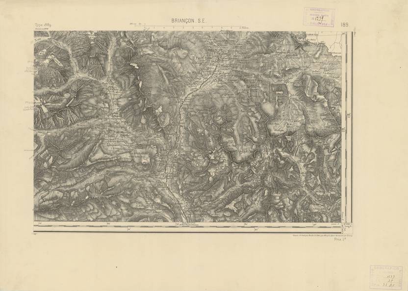 "Paris. - Service Géograèhique de l'Armée, 1889. Ebbe origine dall'Edizione zincografica in quarti di foglio, stabilita fino dal 1879, per la Carta detta de "L'etat-Major". Infatti non rispondendo più il sistema della riproduzione zincografica alle esigenze che la revisione dei fogli imponeva per un inevitabile logoramento dei rami originali, fu proposta dapprima la correzione degli zinchi, ma questo, importando un lavoro lungo e gravoso, si adottò il procedimento galvanico. I rami galvanici ottenuti e corretti secondo questo sistema presero il nome di "édition type 1889". Allo scopo di facilitare l'incisione fu adoperata la suddivisione in quarti di foglio come per l'edizione zincografica. la revisione dei fogli di questo tipo nnn fu iniziata che nel 1893. Dal catalogo del S.G.A. risultano mancanti a questa edizione i dipartimenti della "Moselle", del "Bas-Rhin" e del "Haut-Rhin" per le quali non esiste che una edizione in fogli interi aggiornata nel 1901."