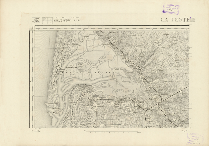 "Paris. - Service Géograèhique de l'Armée, 1889. Ebbe origine dall'Edizione zincografica in quarti di foglio, stabilita fino dal 1879, per la Carta detta de "L'etat-Major". Infatti non rispondendo più il sistema della riproduzione zincografica alle esigenze che la revisione dei fogli imponeva per un inevitabile logoramento dei rami originali, fu proposta dapprima la correzione degli zinchi, ma questo, importando un lavoro lungo e gravoso, si adottò il procedimento galvanico. I rami galvanici ottenuti e corretti secondo questo sistema presero il nome di "édition type 1889". Allo scopo di facilitare l'incisione fu adoperata la suddivisione in quarti di foglio come per l'edizione zincografica. la revisione dei fogli di questo tipo nnn fu iniziata che nel 1893. Dal catalogo del S.G.A. risultano mancanti a questa edizione i dipartimenti della "Moselle", del "Bas-Rhin" e del "Haut-Rhin" per le quali non esiste che una edizione in fogli interi aggiornata nel 1901."