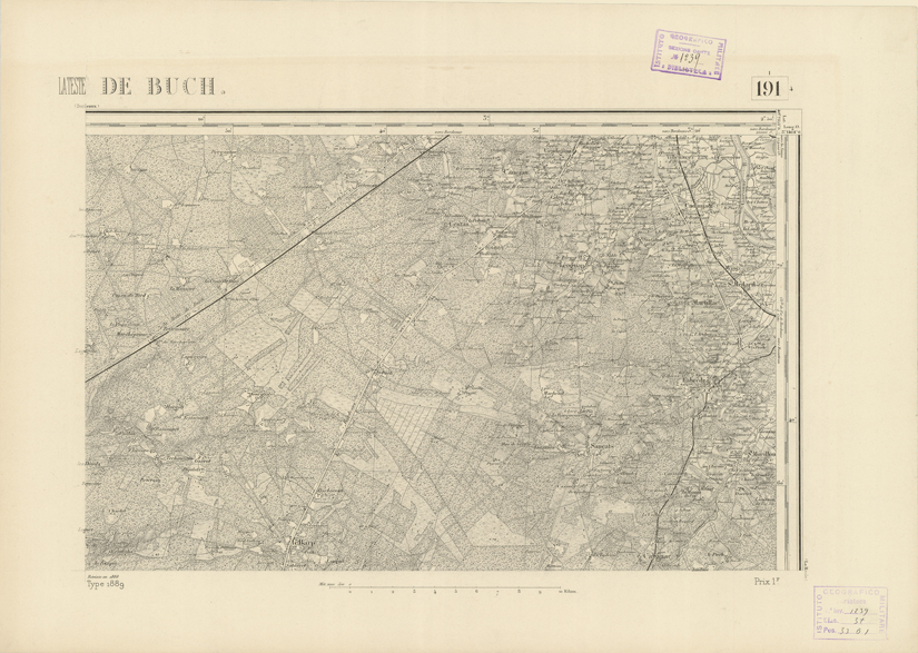 "Paris. - Service Géograèhique de l'Armée, 1889. Ebbe origine dall'Edizione zincografica in quarti di foglio, stabilita fino dal 1879, per la Carta detta de "L'etat-Major". Infatti non rispondendo più il sistema della riproduzione zincografica alle esigenze che la revisione dei fogli imponeva per un inevitabile logoramento dei rami originali, fu proposta dapprima la correzione degli zinchi, ma questo, importando un lavoro lungo e gravoso, si adottò il procedimento galvanico. I rami galvanici ottenuti e corretti secondo questo sistema presero il nome di "édition type 1889". Allo scopo di facilitare l'incisione fu adoperata la suddivisione in quarti di foglio come per l'edizione zincografica. la revisione dei fogli di questo tipo nnn fu iniziata che nel 1893. Dal catalogo del S.G.A. risultano mancanti a questa edizione i dipartimenti della "Moselle", del "Bas-Rhin" e del "Haut-Rhin" per le quali non esiste che una edizione in fogli interi aggiornata nel 1901."
