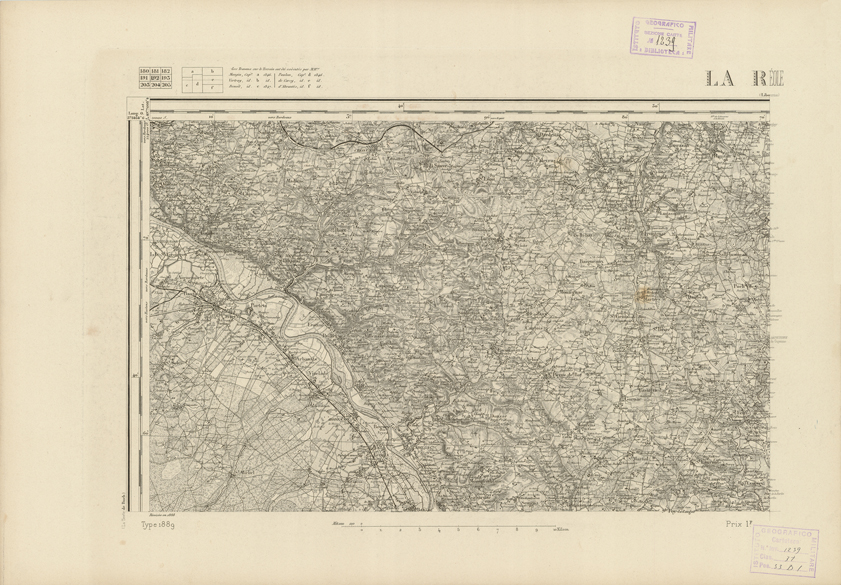 "Paris. - Service Géograèhique de l'Armée, 1889. Ebbe origine dall'Edizione zincografica in quarti di foglio, stabilita fino dal 1879, per la Carta detta de "L'etat-Major". Infatti non rispondendo più il sistema della riproduzione zincografica alle esigenze che la revisione dei fogli imponeva per un inevitabile logoramento dei rami originali, fu proposta dapprima la correzione degli zinchi, ma questo, importando un lavoro lungo e gravoso, si adottò il procedimento galvanico. I rami galvanici ottenuti e corretti secondo questo sistema presero il nome di "édition type 1889". Allo scopo di facilitare l'incisione fu adoperata la suddivisione in quarti di foglio come per l'edizione zincografica. la revisione dei fogli di questo tipo nnn fu iniziata che nel 1893. Dal catalogo del S.G.A. risultano mancanti a questa edizione i dipartimenti della "Moselle", del "Bas-Rhin" e del "Haut-Rhin" per le quali non esiste che una edizione in fogli interi aggiornata nel 1901."