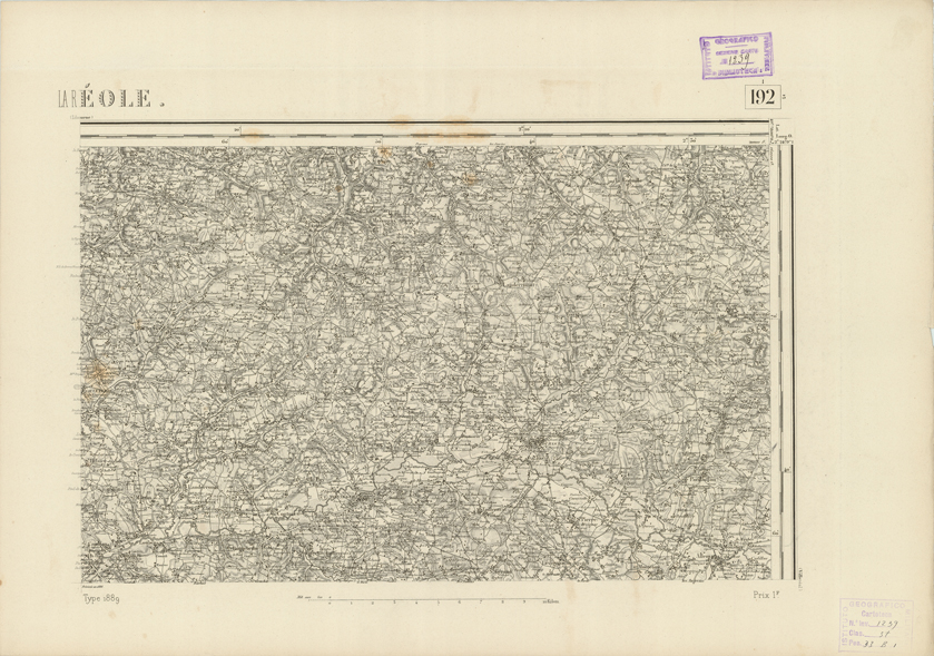 "Paris. - Service Géograèhique de l'Armée, 1889. Ebbe origine dall'Edizione zincografica in quarti di foglio, stabilita fino dal 1879, per la Carta detta de "L'etat-Major". Infatti non rispondendo più il sistema della riproduzione zincografica alle esigenze che la revisione dei fogli imponeva per un inevitabile logoramento dei rami originali, fu proposta dapprima la correzione degli zinchi, ma questo, importando un lavoro lungo e gravoso, si adottò il procedimento galvanico. I rami galvanici ottenuti e corretti secondo questo sistema presero il nome di "édition type 1889". Allo scopo di facilitare l'incisione fu adoperata la suddivisione in quarti di foglio come per l'edizione zincografica. la revisione dei fogli di questo tipo nnn fu iniziata che nel 1893. Dal catalogo del S.G.A. risultano mancanti a questa edizione i dipartimenti della "Moselle", del "Bas-Rhin" e del "Haut-Rhin" per le quali non esiste che una edizione in fogli interi aggiornata nel 1901."