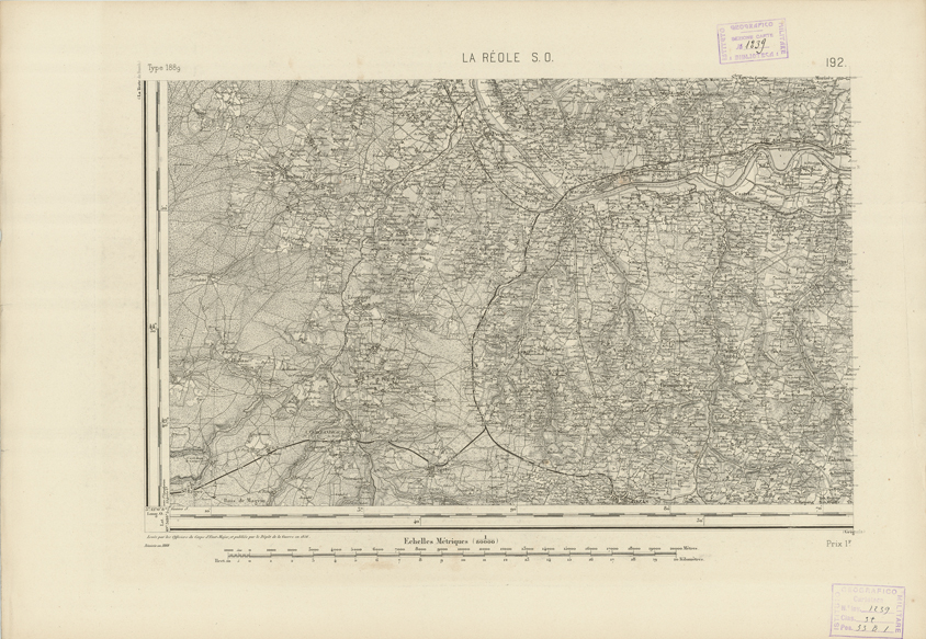 "Paris. - Service Géograèhique de l'Armée, 1889. Ebbe origine dall'Edizione zincografica in quarti di foglio, stabilita fino dal 1879, per la Carta detta de "L'etat-Major". Infatti non rispondendo più il sistema della riproduzione zincografica alle esigenze che la revisione dei fogli imponeva per un inevitabile logoramento dei rami originali, fu proposta dapprima la correzione degli zinchi, ma questo, importando un lavoro lungo e gravoso, si adottò il procedimento galvanico. I rami galvanici ottenuti e corretti secondo questo sistema presero il nome di "édition type 1889". Allo scopo di facilitare l'incisione fu adoperata la suddivisione in quarti di foglio come per l'edizione zincografica. la revisione dei fogli di questo tipo nnn fu iniziata che nel 1893. Dal catalogo del S.G.A. risultano mancanti a questa edizione i dipartimenti della "Moselle", del "Bas-Rhin" e del "Haut-Rhin" per le quali non esiste che una edizione in fogli interi aggiornata nel 1901."