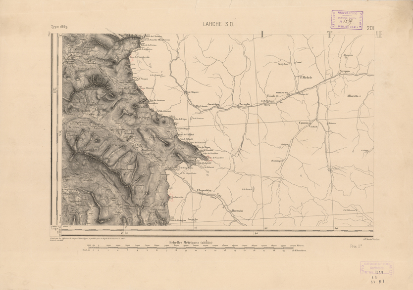 "Paris. - Service Géograèhique de l'Armée, 1889. Ebbe origine dall'Edizione zincografica in quarti di foglio, stabilita fino dal 1879, per la Carta detta de "L'etat-Major". Infatti non rispondendo più il sistema della riproduzione zincografica alle esigenze che la revisione dei fogli imponeva per un inevitabile logoramento dei rami originali, fu proposta dapprima la correzione degli zinchi, ma questo, importando un lavoro lungo e gravoso, si adottò il procedimento galvanico. I rami galvanici ottenuti e corretti secondo questo sistema presero il nome di "édition type 1889". Allo scopo di facilitare l'incisione fu adoperata la suddivisione in quarti di foglio come per l'edizione zincografica. la revisione dei fogli di questo tipo nnn fu iniziata che nel 1893. Dal catalogo del S.G.A. risultano mancanti a questa edizione i dipartimenti della "Moselle", del "Bas-Rhin" e del "Haut-Rhin" per le quali non esiste che una edizione in fogli interi aggiornata nel 1901."