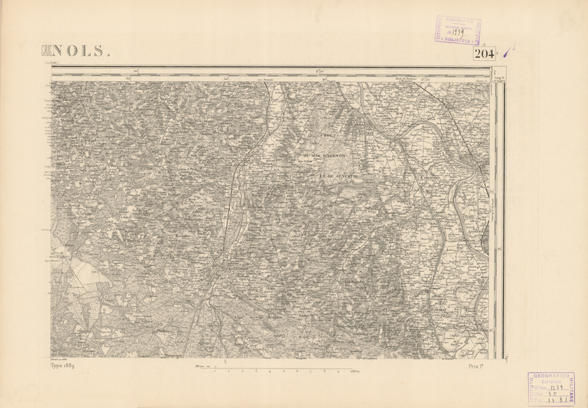 "Paris. - Service Géograèhique de l'Armée, 1889. Ebbe origine dall'Edizione zincografica in quarti di foglio, stabilita fino dal 1879, per la Carta detta de "L'etat-Major". Infatti non rispondendo più il sistema della riproduzione zincografica alle esigenze che la revisione dei fogli imponeva per un inevitabile logoramento dei rami originali, fu proposta dapprima la correzione degli zinchi, ma questo, importando un lavoro lungo e gravoso, si adottò il procedimento galvanico. I rami galvanici ottenuti e corretti secondo questo sistema presero il nome di "édition type 1889". Allo scopo di facilitare l'incisione fu adoperata la suddivisione in quarti di foglio come per l'edizione zincografica. la revisione dei fogli di questo tipo nnn fu iniziata che nel 1893. Dal catalogo del S.G.A. risultano mancanti a questa edizione i dipartimenti della "Moselle", del "Bas-Rhin" e del "Haut-Rhin" per le quali non esiste che una edizione in fogli interi aggiornata nel 1901."
