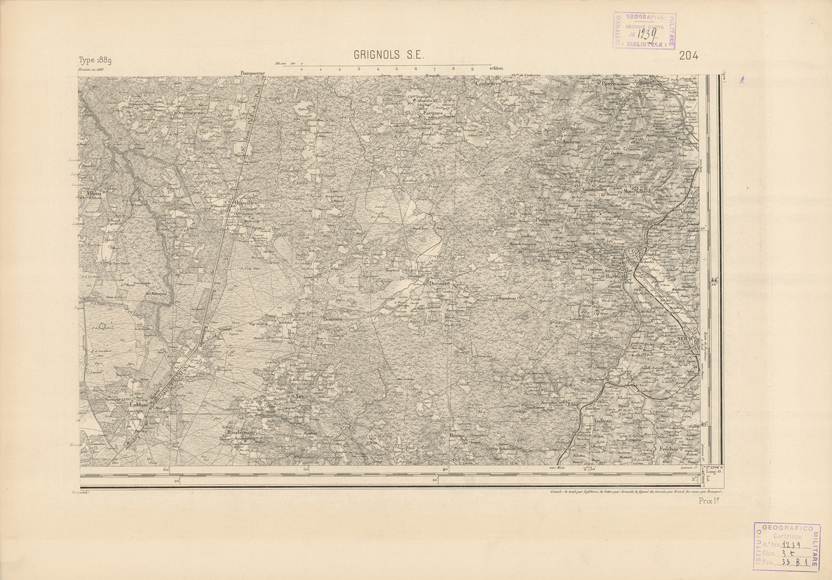 "Paris. - Service Géograèhique de l'Armée, 1889. Ebbe origine dall'Edizione zincografica in quarti di foglio, stabilita fino dal 1879, per la Carta detta de "L'etat-Major". Infatti non rispondendo più il sistema della riproduzione zincografica alle esigenze che la revisione dei fogli imponeva per un inevitabile logoramento dei rami originali, fu proposta dapprima la correzione degli zinchi, ma questo, importando un lavoro lungo e gravoso, si adottò il procedimento galvanico. I rami galvanici ottenuti e corretti secondo questo sistema presero il nome di "édition type 1889". Allo scopo di facilitare l'incisione fu adoperata la suddivisione in quarti di foglio come per l'edizione zincografica. la revisione dei fogli di questo tipo nnn fu iniziata che nel 1893. Dal catalogo del S.G.A. risultano mancanti a questa edizione i dipartimenti della "Moselle", del "Bas-Rhin" e del "Haut-Rhin" per le quali non esiste che una edizione in fogli interi aggiornata nel 1901."