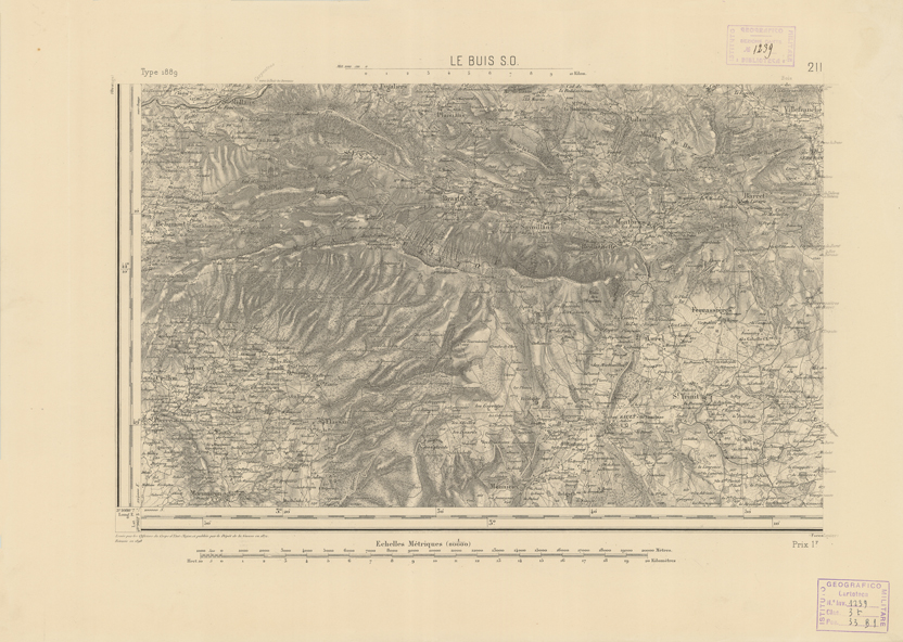 "Paris. - Service Géograèhique de l'Armée, 1889. Ebbe origine dall'Edizione zincografica in quarti di foglio, stabilita fino dal 1879, per la Carta detta de "L'etat-Major". Infatti non rispondendo più il sistema della riproduzione zincografica alle esigenze che la revisione dei fogli imponeva per un inevitabile logoramento dei rami originali, fu proposta dapprima la correzione degli zinchi, ma questo, importando un lavoro lungo e gravoso, si adottò il procedimento galvanico. I rami galvanici ottenuti e corretti secondo questo sistema presero il nome di "édition type 1889". Allo scopo di facilitare l'incisione fu adoperata la suddivisione in quarti di foglio come per l'edizione zincografica. la revisione dei fogli di questo tipo nnn fu iniziata che nel 1893. Dal catalogo del S.G.A. risultano mancanti a questa edizione i dipartimenti della "Moselle", del "Bas-Rhin" e del "Haut-Rhin" per le quali non esiste che una edizione in fogli interi aggiornata nel 1901."