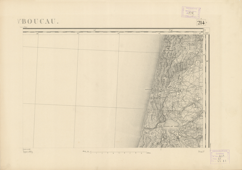 "Paris. - Service Géograèhique de l'Armée, 1889. Ebbe origine dall'Edizione zincografica in quarti di foglio, stabilita fino dal 1879, per la Carta detta de "L'etat-Major". Infatti non rispondendo più il sistema della riproduzione zincografica alle esigenze che la revisione dei fogli imponeva per un inevitabile logoramento dei rami originali, fu proposta dapprima la correzione degli zinchi, ma questo, importando un lavoro lungo e gravoso, si adottò il procedimento galvanico. I rami galvanici ottenuti e corretti secondo questo sistema presero il nome di "édition type 1889". Allo scopo di facilitare l'incisione fu adoperata la suddivisione in quarti di foglio come per l'edizione zincografica. la revisione dei fogli di questo tipo nnn fu iniziata che nel 1893. Dal catalogo del S.G.A. risultano mancanti a questa edizione i dipartimenti della "Moselle", del "Bas-Rhin" e del "Haut-Rhin" per le quali non esiste che una edizione in fogli interi aggiornata nel 1901."