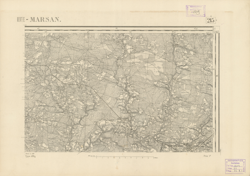 "Paris. - Service Géograèhique de l'Armée, 1889. Ebbe origine dall'Edizione zincografica in quarti di foglio, stabilita fino dal 1879, per la Carta detta de "L'etat-Major". Infatti non rispondendo più il sistema della riproduzione zincografica alle esigenze che la revisione dei fogli imponeva per un inevitabile logoramento dei rami originali, fu proposta dapprima la correzione degli zinchi, ma questo, importando un lavoro lungo e gravoso, si adottò il procedimento galvanico. I rami galvanici ottenuti e corretti secondo questo sistema presero il nome di "édition type 1889". Allo scopo di facilitare l'incisione fu adoperata la suddivisione in quarti di foglio come per l'edizione zincografica. la revisione dei fogli di questo tipo nnn fu iniziata che nel 1893. Dal catalogo del S.G.A. risultano mancanti a questa edizione i dipartimenti della "Moselle", del "Bas-Rhin" e del "Haut-Rhin" per le quali non esiste che una edizione in fogli interi aggiornata nel 1901."