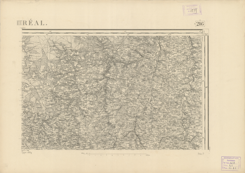 "Paris. - Service Géograèhique de l'Armée, 1889. Ebbe origine dall'Edizione zincografica in quarti di foglio, stabilita fino dal 1879, per la Carta detta de "L'etat-Major". Infatti non rispondendo più il sistema della riproduzione zincografica alle esigenze che la revisione dei fogli imponeva per un inevitabile logoramento dei rami originali, fu proposta dapprima la correzione degli zinchi, ma questo, importando un lavoro lungo e gravoso, si adottò il procedimento galvanico. I rami galvanici ottenuti e corretti secondo questo sistema presero il nome di "édition type 1889". Allo scopo di facilitare l'incisione fu adoperata la suddivisione in quarti di foglio come per l'edizione zincografica. la revisione dei fogli di questo tipo nnn fu iniziata che nel 1893. Dal catalogo del S.G.A. risultano mancanti a questa edizione i dipartimenti della "Moselle", del "Bas-Rhin" e del "Haut-Rhin" per le quali non esiste che una edizione in fogli interi aggiornata nel 1901."