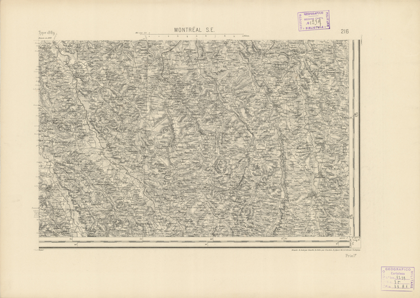"Paris. - Service Géograèhique de l'Armée, 1889. Ebbe origine dall'Edizione zincografica in quarti di foglio, stabilita fino dal 1879, per la Carta detta de "L'etat-Major". Infatti non rispondendo più il sistema della riproduzione zincografica alle esigenze che la revisione dei fogli imponeva per un inevitabile logoramento dei rami originali, fu proposta dapprima la correzione degli zinchi, ma questo, importando un lavoro lungo e gravoso, si adottò il procedimento galvanico. I rami galvanici ottenuti e corretti secondo questo sistema presero il nome di "édition type 1889". Allo scopo di facilitare l'incisione fu adoperata la suddivisione in quarti di foglio come per l'edizione zincografica. la revisione dei fogli di questo tipo nnn fu iniziata che nel 1893. Dal catalogo del S.G.A. risultano mancanti a questa edizione i dipartimenti della "Moselle", del "Bas-Rhin" e del "Haut-Rhin" per le quali non esiste che una edizione in fogli interi aggiornata nel 1901."