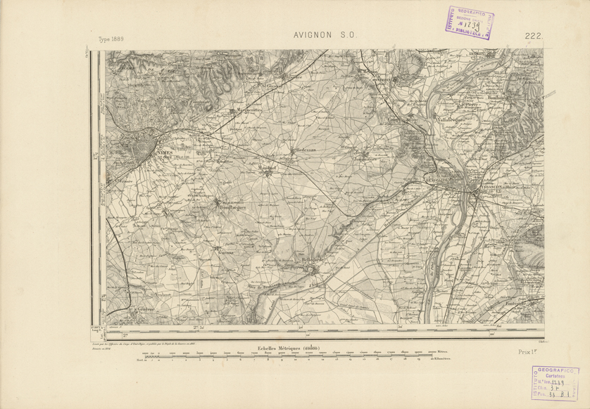 "Paris. - Service Géograèhique de l'Armée, 1889. Ebbe origine dall'Edizione zincografica in quarti di foglio, stabilita fino dal 1879, per la Carta detta de "L'etat-Major". Infatti non rispondendo più il sistema della riproduzione zincografica alle esigenze che la revisione dei fogli imponeva per un inevitabile logoramento dei rami originali, fu proposta dapprima la correzione degli zinchi, ma questo, importando un lavoro lungo e gravoso, si adottò il procedimento galvanico. I rami galvanici ottenuti e corretti secondo questo sistema presero il nome di "édition type 1889". Allo scopo di facilitare l'incisione fu adoperata la suddivisione in quarti di foglio come per l'edizione zincografica. la revisione dei fogli di questo tipo nnn fu iniziata che nel 1893. Dal catalogo del S.G.A. risultano mancanti a questa edizione i dipartimenti della "Moselle", del "Bas-Rhin" e del "Haut-Rhin" per le quali non esiste che una edizione in fogli interi aggiornata nel 1901."