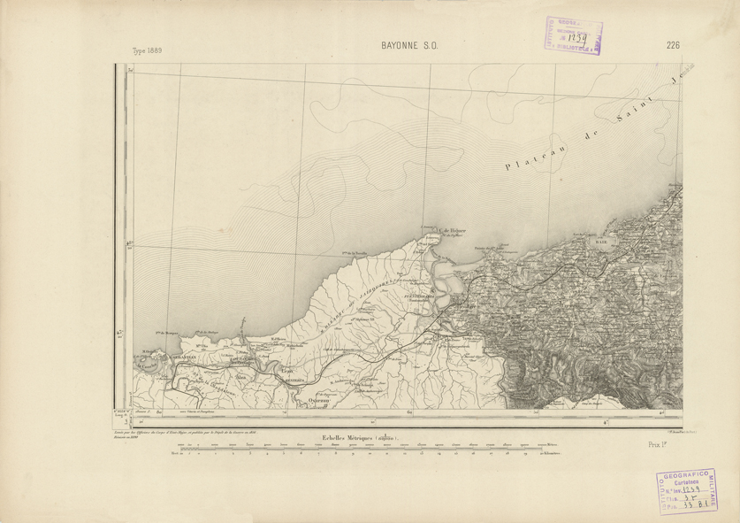 "Paris. - Service Géograèhique de l'Armée, 1889. Ebbe origine dall'Edizione zincografica in quarti di foglio, stabilita fino dal 1879, per la Carta detta de "L'etat-Major". Infatti non rispondendo più il sistema della riproduzione zincografica alle esigenze che la revisione dei fogli imponeva per un inevitabile logoramento dei rami originali, fu proposta dapprima la correzione degli zinchi, ma questo, importando un lavoro lungo e gravoso, si adottò il procedimento galvanico. I rami galvanici ottenuti e corretti secondo questo sistema presero il nome di "édition type 1889". Allo scopo di facilitare l'incisione fu adoperata la suddivisione in quarti di foglio come per l'edizione zincografica. la revisione dei fogli di questo tipo nnn fu iniziata che nel 1893. Dal catalogo del S.G.A. risultano mancanti a questa edizione i dipartimenti della "Moselle", del "Bas-Rhin" e del "Haut-Rhin" per le quali non esiste che una edizione in fogli interi aggiornata nel 1901."
