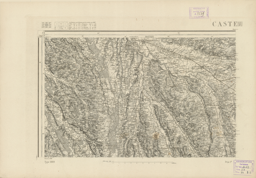 "Paris. - Service Géograèhique de l'Armée, 1889. Ebbe origine dall'Edizione zincografica in quarti di foglio, stabilita fino dal 1879, per la Carta detta de "L'etat-Major". Infatti non rispondendo più il sistema della riproduzione zincografica alle esigenze che la revisione dei fogli imponeva per un inevitabile logoramento dei rami originali, fu proposta dapprima la correzione degli zinchi, ma questo, importando un lavoro lungo e gravoso, si adottò il procedimento galvanico. I rami galvanici ottenuti e corretti secondo questo sistema presero il nome di "édition type 1889". Allo scopo di facilitare l'incisione fu adoperata la suddivisione in quarti di foglio come per l'edizione zincografica. la revisione dei fogli di questo tipo nnn fu iniziata che nel 1893. Dal catalogo del S.G.A. risultano mancanti a questa edizione i dipartimenti della "Moselle", del "Bas-Rhin" e del "Haut-Rhin" per le quali non esiste che una edizione in fogli interi aggiornata nel 1901."