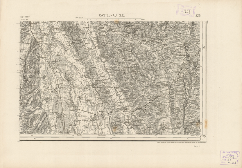 "Paris. - Service Géograèhique de l'Armée, 1889. Ebbe origine dall'Edizione zincografica in quarti di foglio, stabilita fino dal 1879, per la Carta detta de "L'etat-Major". Infatti non rispondendo più il sistema della riproduzione zincografica alle esigenze che la revisione dei fogli imponeva per un inevitabile logoramento dei rami originali, fu proposta dapprima la correzione degli zinchi, ma questo, importando un lavoro lungo e gravoso, si adottò il procedimento galvanico. I rami galvanici ottenuti e corretti secondo questo sistema presero il nome di "édition type 1889". Allo scopo di facilitare l'incisione fu adoperata la suddivisione in quarti di foglio come per l'edizione zincografica. la revisione dei fogli di questo tipo nnn fu iniziata che nel 1893. Dal catalogo del S.G.A. risultano mancanti a questa edizione i dipartimenti della "Moselle", del "Bas-Rhin" e del "Haut-Rhin" per le quali non esiste che una edizione in fogli interi aggiornata nel 1901."