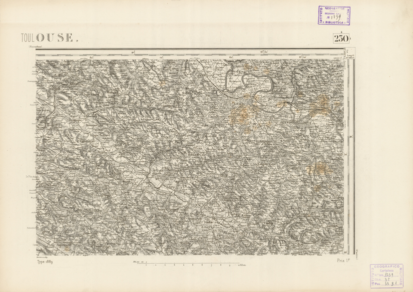 "Paris. - Service Géograèhique de l'Armée, 1889. Ebbe origine dall'Edizione zincografica in quarti di foglio, stabilita fino dal 1879, per la Carta detta de "L'etat-Major". Infatti non rispondendo più il sistema della riproduzione zincografica alle esigenze che la revisione dei fogli imponeva per un inevitabile logoramento dei rami originali, fu proposta dapprima la correzione degli zinchi, ma questo, importando un lavoro lungo e gravoso, si adottò il procedimento galvanico. I rami galvanici ottenuti e corretti secondo questo sistema presero il nome di "édition type 1889". Allo scopo di facilitare l'incisione fu adoperata la suddivisione in quarti di foglio come per l'edizione zincografica. la revisione dei fogli di questo tipo nnn fu iniziata che nel 1893. Dal catalogo del S.G.A. risultano mancanti a questa edizione i dipartimenti della "Moselle", del "Bas-Rhin" e del "Haut-Rhin" per le quali non esiste che una edizione in fogli interi aggiornata nel 1901."