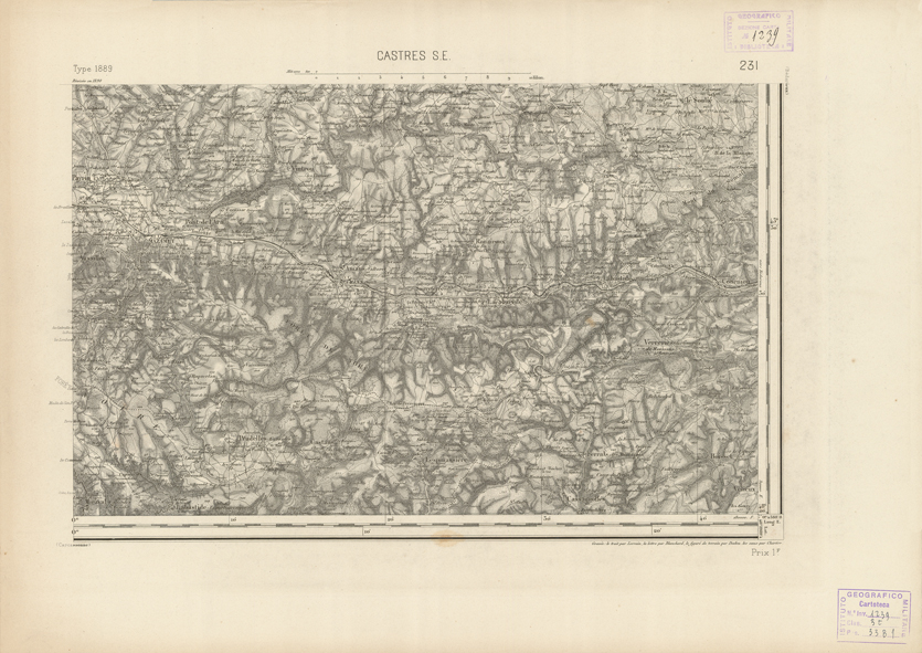 "Paris. - Service Géograèhique de l'Armée, 1889. Ebbe origine dall'Edizione zincografica in quarti di foglio, stabilita fino dal 1879, per la Carta detta de "L'etat-Major". Infatti non rispondendo più il sistema della riproduzione zincografica alle esigenze che la revisione dei fogli imponeva per un inevitabile logoramento dei rami originali, fu proposta dapprima la correzione degli zinchi, ma questo, importando un lavoro lungo e gravoso, si adottò il procedimento galvanico. I rami galvanici ottenuti e corretti secondo questo sistema presero il nome di "édition type 1889". Allo scopo di facilitare l'incisione fu adoperata la suddivisione in quarti di foglio come per l'edizione zincografica. la revisione dei fogli di questo tipo nnn fu iniziata che nel 1893. Dal catalogo del S.G.A. risultano mancanti a questa edizione i dipartimenti della "Moselle", del "Bas-Rhin" e del "Haut-Rhin" per le quali non esiste che una edizione in fogli interi aggiornata nel 1901."