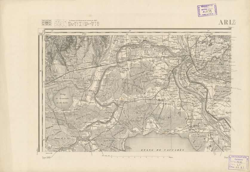 "Paris. - Service Géograèhique de l'Armée, 1889. Ebbe origine dall'Edizione zincografica in quarti di foglio, stabilita fino dal 1879, per la Carta detta de "L'etat-Major". Infatti non rispondendo più il sistema della riproduzione zincografica alle esigenze che la revisione dei fogli imponeva per un inevitabile logoramento dei rami originali, fu proposta dapprima la correzione degli zinchi, ma questo, importando un lavoro lungo e gravoso, si adottò il procedimento galvanico. I rami galvanici ottenuti e corretti secondo questo sistema presero il nome di "édition type 1889". Allo scopo di facilitare l'incisione fu adoperata la suddivisione in quarti di foglio come per l'edizione zincografica. la revisione dei fogli di questo tipo nnn fu iniziata che nel 1893. Dal catalogo del S.G.A. risultano mancanti a questa edizione i dipartimenti della "Moselle", del "Bas-Rhin" e del "Haut-Rhin" per le quali non esiste che una edizione in fogli interi aggiornata nel 1901."