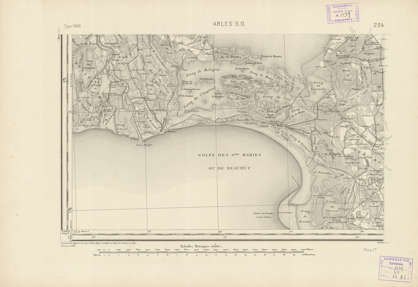 "Paris. - Service Géograèhique de l'Armée, 1889. Ebbe origine dall'Edizione zincografica in quarti di foglio, stabilita fino dal 1879, per la Carta detta de "L'etat-Major". Infatti non rispondendo più il sistema della riproduzione zincografica alle esigenze che la revisione dei fogli imponeva per un inevitabile logoramento dei rami originali, fu proposta dapprima la correzione degli zinchi, ma questo, importando un lavoro lungo e gravoso, si adottò il procedimento galvanico. I rami galvanici ottenuti e corretti secondo questo sistema presero il nome di "édition type 1889". Allo scopo di facilitare l'incisione fu adoperata la suddivisione in quarti di foglio come per l'edizione zincografica. la revisione dei fogli di questo tipo nnn fu iniziata che nel 1893. Dal catalogo del S.G.A. risultano mancanti a questa edizione i dipartimenti della "Moselle", del "Bas-Rhin" e del "Haut-Rhin" per le quali non esiste che una edizione in fogli interi aggiornata nel 1901."