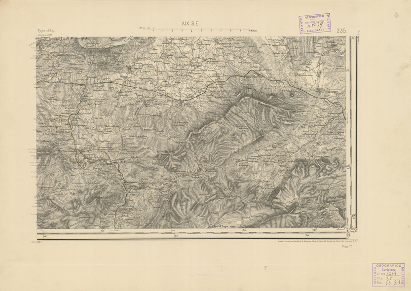"Paris. - Service Géograèhique de l'Armée, 1889. Ebbe origine dall'Edizione zincografica in quarti di foglio, stabilita fino dal 1879, per la Carta detta de "L'etat-Major". Infatti non rispondendo più il sistema della riproduzione zincografica alle esigenze che la revisione dei fogli imponeva per un inevitabile logoramento dei rami originali, fu proposta dapprima la correzione degli zinchi, ma questo, importando un lavoro lungo e gravoso, si adottò il procedimento galvanico. I rami galvanici ottenuti e corretti secondo questo sistema presero il nome di "édition type 1889". Allo scopo di facilitare l'incisione fu adoperata la suddivisione in quarti di foglio come per l'edizione zincografica. la revisione dei fogli di questo tipo nnn fu iniziata che nel 1893. Dal catalogo del S.G.A. risultano mancanti a questa edizione i dipartimenti della "Moselle", del "Bas-Rhin" e del "Haut-Rhin" per le quali non esiste che una edizione in fogli interi aggiornata nel 1901."