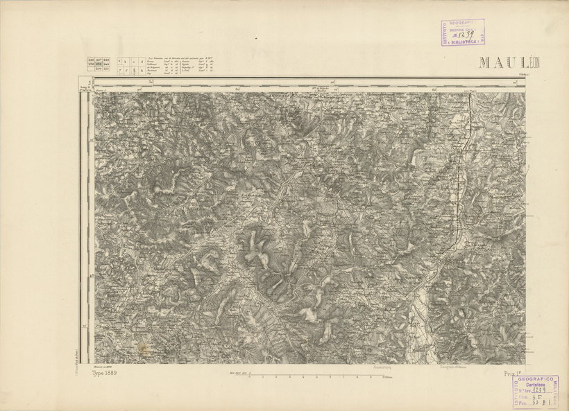 "Paris. - Service Géograèhique de l'Armée, 1889. Ebbe origine dall'Edizione zincografica in quarti di foglio, stabilita fino dal 1879, per la Carta detta de "L'etat-Major". Infatti non rispondendo più il sistema della riproduzione zincografica alle esigenze che la revisione dei fogli imponeva per un inevitabile logoramento dei rami originali, fu proposta dapprima la correzione degli zinchi, ma questo, importando un lavoro lungo e gravoso, si adottò il procedimento galvanico. I rami galvanici ottenuti e corretti secondo questo sistema presero il nome di "édition type 1889". Allo scopo di facilitare l'incisione fu adoperata la suddivisione in quarti di foglio come per l'edizione zincografica. la revisione dei fogli di questo tipo nnn fu iniziata che nel 1893. Dal catalogo del S.G.A. risultano mancanti a questa edizione i dipartimenti della "Moselle", del "Bas-Rhin" e del "Haut-Rhin" per le quali non esiste che una edizione in fogli interi aggiornata nel 1901."