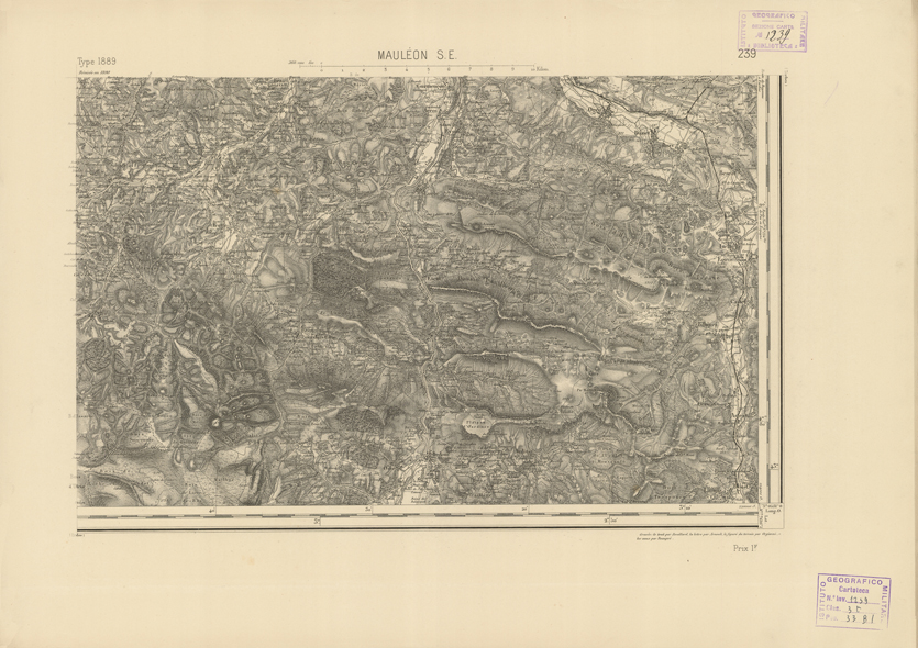 "Paris. - Service Géograèhique de l'Armée, 1889. Ebbe origine dall'Edizione zincografica in quarti di foglio, stabilita fino dal 1879, per la Carta detta de "L'etat-Major". Infatti non rispondendo più il sistema della riproduzione zincografica alle esigenze che la revisione dei fogli imponeva per un inevitabile logoramento dei rami originali, fu proposta dapprima la correzione degli zinchi, ma questo, importando un lavoro lungo e gravoso, si adottò il procedimento galvanico. I rami galvanici ottenuti e corretti secondo questo sistema presero il nome di "édition type 1889". Allo scopo di facilitare l'incisione fu adoperata la suddivisione in quarti di foglio come per l'edizione zincografica. la revisione dei fogli di questo tipo nnn fu iniziata che nel 1893. Dal catalogo del S.G.A. risultano mancanti a questa edizione i dipartimenti della "Moselle", del "Bas-Rhin" e del "Haut-Rhin" per le quali non esiste che una edizione in fogli interi aggiornata nel 1901."