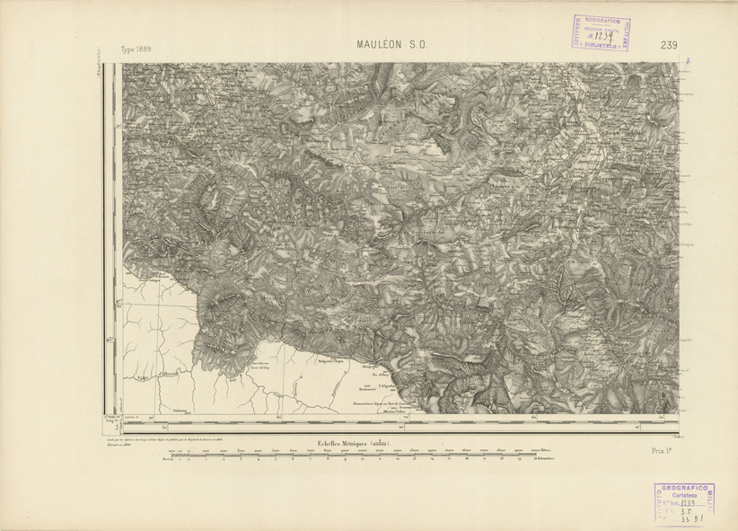 "Paris. - Service Géograèhique de l'Armée, 1889. Ebbe origine dall'Edizione zincografica in quarti di foglio, stabilita fino dal 1879, per la Carta detta de "L'etat-Major". Infatti non rispondendo più il sistema della riproduzione zincografica alle esigenze che la revisione dei fogli imponeva per un inevitabile logoramento dei rami originali, fu proposta dapprima la correzione degli zinchi, ma questo, importando un lavoro lungo e gravoso, si adottò il procedimento galvanico. I rami galvanici ottenuti e corretti secondo questo sistema presero il nome di "édition type 1889". Allo scopo di facilitare l'incisione fu adoperata la suddivisione in quarti di foglio come per l'edizione zincografica. la revisione dei fogli di questo tipo nnn fu iniziata che nel 1893. Dal catalogo del S.G.A. risultano mancanti a questa edizione i dipartimenti della "Moselle", del "Bas-Rhin" e del "Haut-Rhin" per le quali non esiste che una edizione in fogli interi aggiornata nel 1901."