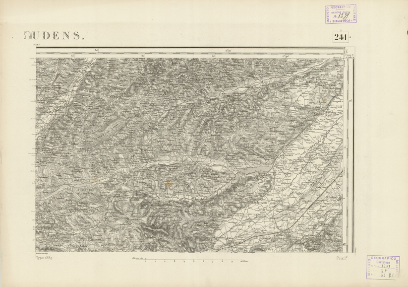 "Paris. - Service Géograèhique de l'Armée, 1889. Ebbe origine dall'Edizione zincografica in quarti di foglio, stabilita fino dal 1879, per la Carta detta de "L'etat-Major". Infatti non rispondendo più il sistema della riproduzione zincografica alle esigenze che la revisione dei fogli imponeva per un inevitabile logoramento dei rami originali, fu proposta dapprima la correzione degli zinchi, ma questo, importando un lavoro lungo e gravoso, si adottò il procedimento galvanico. I rami galvanici ottenuti e corretti secondo questo sistema presero il nome di "édition type 1889". Allo scopo di facilitare l'incisione fu adoperata la suddivisione in quarti di foglio come per l'edizione zincografica. la revisione dei fogli di questo tipo nnn fu iniziata che nel 1893. Dal catalogo del S.G.A. risultano mancanti a questa edizione i dipartimenti della "Moselle", del "Bas-Rhin" e del "Haut-Rhin" per le quali non esiste che una edizione in fogli interi aggiornata nel 1901."