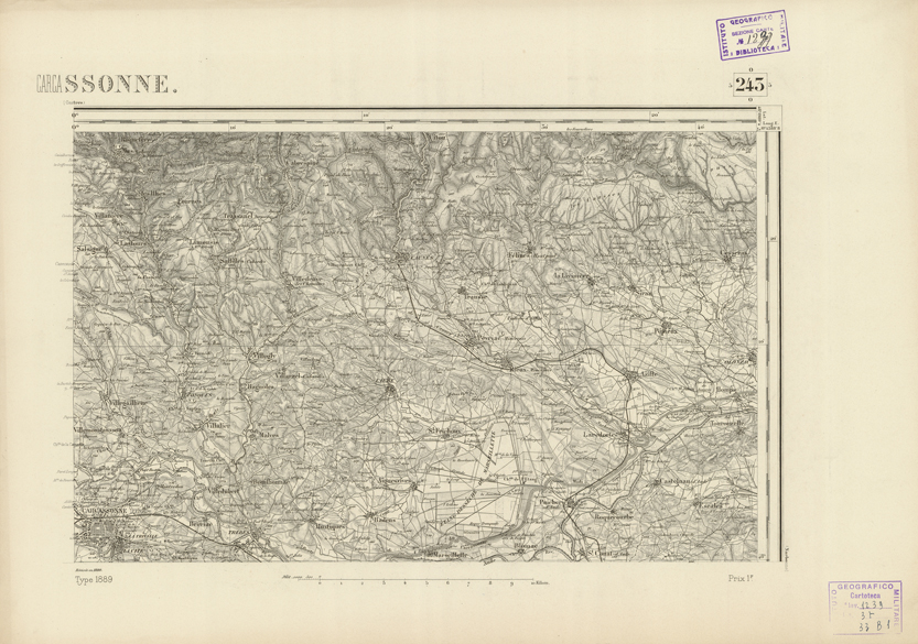 "Paris. - Service Géograèhique de l'Armée, 1889. Ebbe origine dall'Edizione zincografica in quarti di foglio, stabilita fino dal 1879, per la Carta detta de "L'etat-Major". Infatti non rispondendo più il sistema della riproduzione zincografica alle esigenze che la revisione dei fogli imponeva per un inevitabile logoramento dei rami originali, fu proposta dapprima la correzione degli zinchi, ma questo, importando un lavoro lungo e gravoso, si adottò il procedimento galvanico. I rami galvanici ottenuti e corretti secondo questo sistema presero il nome di "édition type 1889". Allo scopo di facilitare l'incisione fu adoperata la suddivisione in quarti di foglio come per l'edizione zincografica. la revisione dei fogli di questo tipo nnn fu iniziata che nel 1893. Dal catalogo del S.G.A. risultano mancanti a questa edizione i dipartimenti della "Moselle", del "Bas-Rhin" e del "Haut-Rhin" per le quali non esiste che una edizione in fogli interi aggiornata nel 1901."