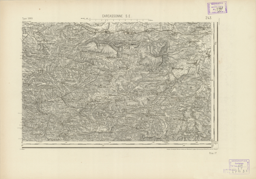 "Paris. - Service Géograèhique de l'Armée, 1889. Ebbe origine dall'Edizione zincografica in quarti di foglio, stabilita fino dal 1879, per la Carta detta de "L'etat-Major". Infatti non rispondendo più il sistema della riproduzione zincografica alle esigenze che la revisione dei fogli imponeva per un inevitabile logoramento dei rami originali, fu proposta dapprima la correzione degli zinchi, ma questo, importando un lavoro lungo e gravoso, si adottò il procedimento galvanico. I rami galvanici ottenuti e corretti secondo questo sistema presero il nome di "édition type 1889". Allo scopo di facilitare l'incisione fu adoperata la suddivisione in quarti di foglio come per l'edizione zincografica. la revisione dei fogli di questo tipo nnn fu iniziata che nel 1893. Dal catalogo del S.G.A. risultano mancanti a questa edizione i dipartimenti della "Moselle", del "Bas-Rhin" e del "Haut-Rhin" per le quali non esiste che una edizione in fogli interi aggiornata nel 1901."