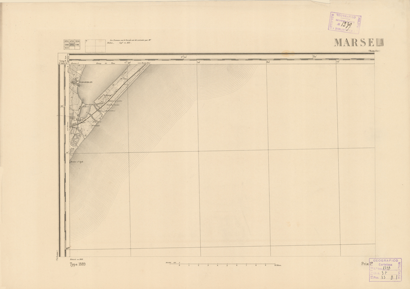 "Paris. - Service Géograèhique de l'Armée, 1889. Ebbe origine dall'Edizione zincografica in quarti di foglio, stabilita fino dal 1879, per la Carta detta de "L'etat-Major". Infatti non rispondendo più il sistema della riproduzione zincografica alle esigenze che la revisione dei fogli imponeva per un inevitabile logoramento dei rami originali, fu proposta dapprima la correzione degli zinchi, ma questo, importando un lavoro lungo e gravoso, si adottò il procedimento galvanico. I rami galvanici ottenuti e corretti secondo questo sistema presero il nome di "édition type 1889". Allo scopo di facilitare l'incisione fu adoperata la suddivisione in quarti di foglio come per l'edizione zincografica. la revisione dei fogli di questo tipo nnn fu iniziata che nel 1893. Dal catalogo del S.G.A. risultano mancanti a questa edizione i dipartimenti della "Moselle", del "Bas-Rhin" e del "Haut-Rhin" per le quali non esiste che una edizione in fogli interi aggiornata nel 1901."