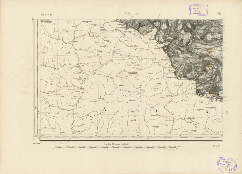 "Paris. - Service Géograèhique de l'Armée, 1889. Ebbe origine dall'Edizione zincografica in quarti di foglio, stabilita fino dal 1879, per la Carta detta de "L'etat-Major". Infatti non rispondendo più il sistema della riproduzione zincografica alle esigenze che la revisione dei fogli imponeva per un inevitabile logoramento dei rami originali, fu proposta dapprima la correzione degli zinchi, ma questo, importando un lavoro lungo e gravoso, si adottò il procedimento galvanico. I rami galvanici ottenuti e corretti secondo questo sistema presero il nome di "édition type 1889". Allo scopo di facilitare l'incisione fu adoperata la suddivisione in quarti di foglio come per l'edizione zincografica. la revisione dei fogli di questo tipo nnn fu iniziata che nel 1893. Dal catalogo del S.G.A. risultano mancanti a questa edizione i dipartimenti della "Moselle", del "Bas-Rhin" e del "Haut-Rhin" per le quali non esiste che una edizione in fogli interi aggiornata nel 1901."