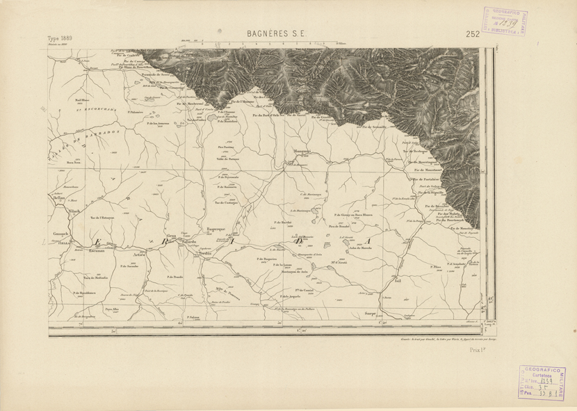 "Paris. - Service Géograèhique de l'Armée, 1889. Ebbe origine dall'Edizione zincografica in quarti di foglio, stabilita fino dal 1879, per la Carta detta de "L'etat-Major". Infatti non rispondendo più il sistema della riproduzione zincografica alle esigenze che la revisione dei fogli imponeva per un inevitabile logoramento dei rami originali, fu proposta dapprima la correzione degli zinchi, ma questo, importando un lavoro lungo e gravoso, si adottò il procedimento galvanico. I rami galvanici ottenuti e corretti secondo questo sistema presero il nome di "édition type 1889". Allo scopo di facilitare l'incisione fu adoperata la suddivisione in quarti di foglio come per l'edizione zincografica. la revisione dei fogli di questo tipo nnn fu iniziata che nel 1893. Dal catalogo del S.G.A. risultano mancanti a questa edizione i dipartimenti della "Moselle", del "Bas-Rhin" e del "Haut-Rhin" per le quali non esiste che una edizione in fogli interi aggiornata nel 1901."