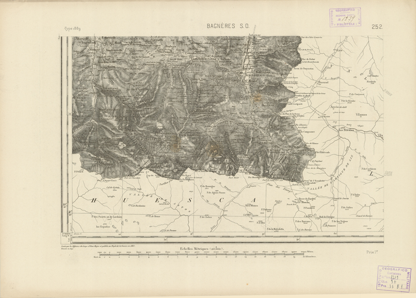 "Paris. - Service Géograèhique de l'Armée, 1889. Ebbe origine dall'Edizione zincografica in quarti di foglio, stabilita fino dal 1879, per la Carta detta de "L'etat-Major". Infatti non rispondendo più il sistema della riproduzione zincografica alle esigenze che la revisione dei fogli imponeva per un inevitabile logoramento dei rami originali, fu proposta dapprima la correzione degli zinchi, ma questo, importando un lavoro lungo e gravoso, si adottò il procedimento galvanico. I rami galvanici ottenuti e corretti secondo questo sistema presero il nome di "édition type 1889". Allo scopo di facilitare l'incisione fu adoperata la suddivisione in quarti di foglio come per l'edizione zincografica. la revisione dei fogli di questo tipo nnn fu iniziata che nel 1893. Dal catalogo del S.G.A. risultano mancanti a questa edizione i dipartimenti della "Moselle", del "Bas-Rhin" e del "Haut-Rhin" per le quali non esiste che una edizione in fogli interi aggiornata nel 1901."